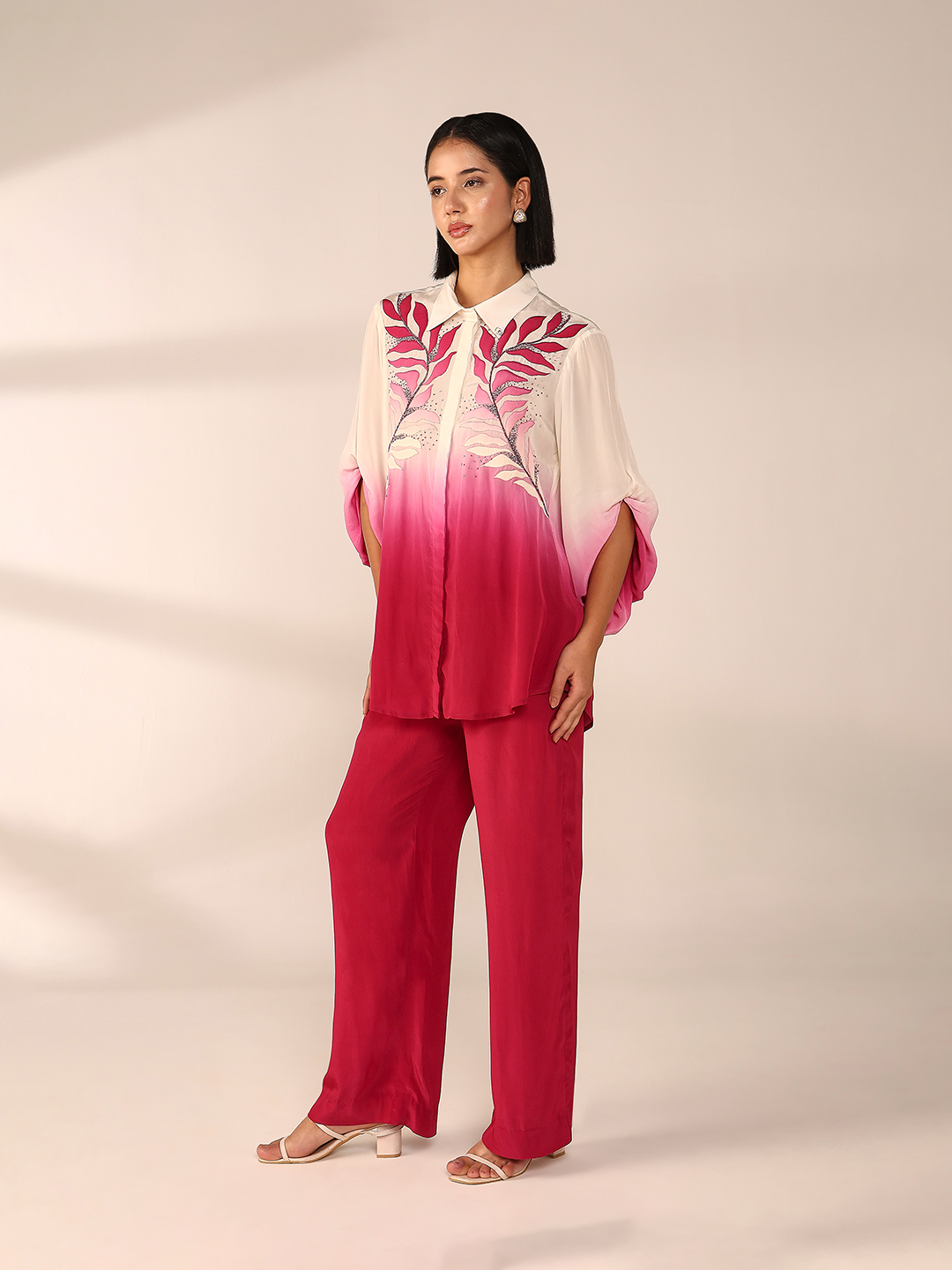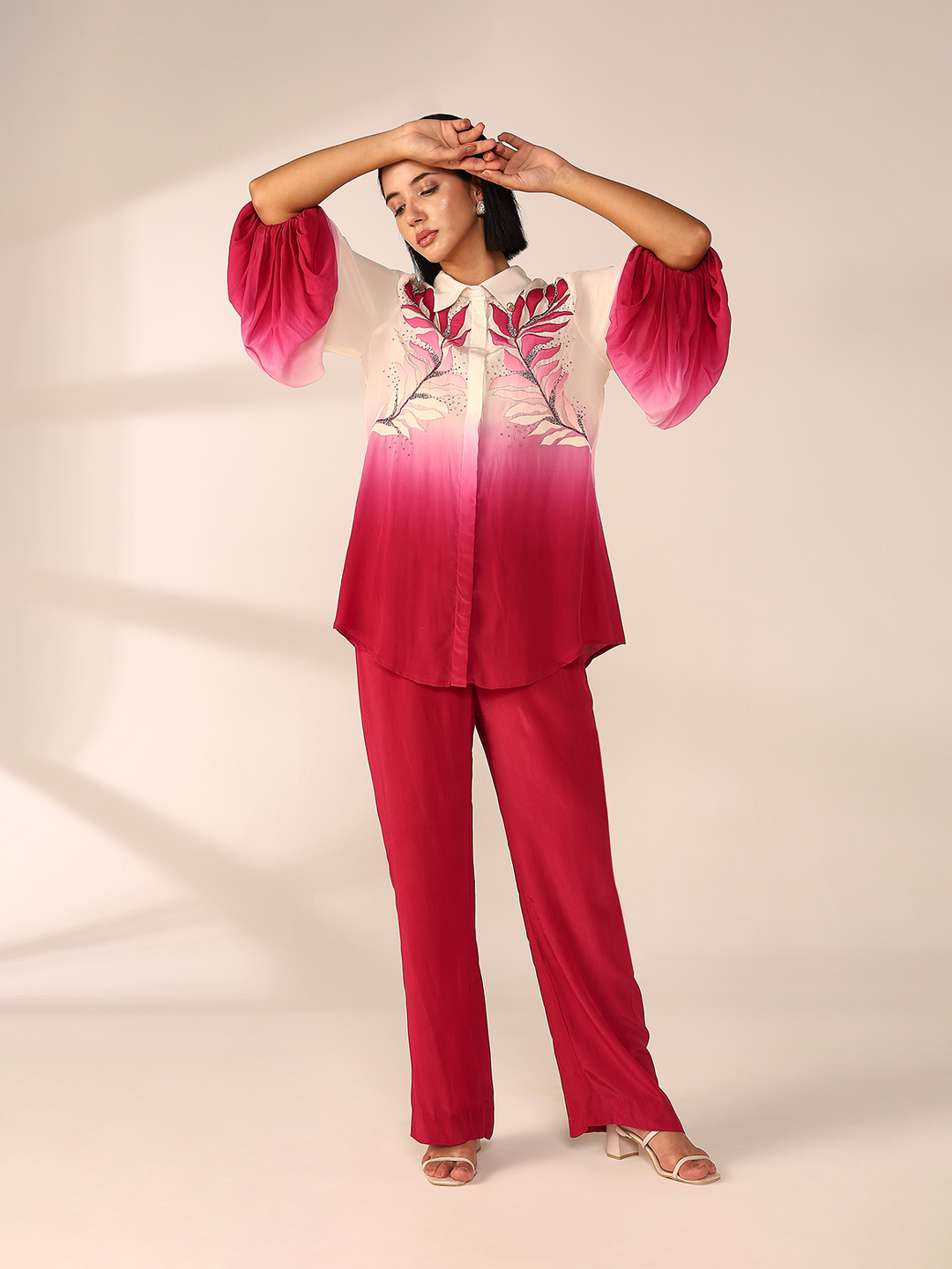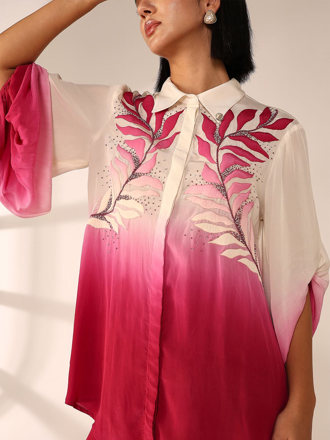 Regular fit silhouette elevated with intricate hand embroidery and dramatic oversized elasticated sleeves. styled with classic straight pant for a...