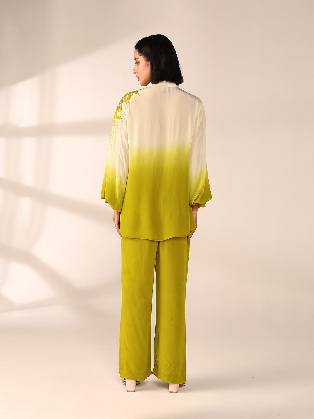 A radiant ombre co ord set with botanical patchwork embroidery placed on one shoulder and highlighted with hand work. paired with straight comfort fit pants. This is designed to carry light with movement