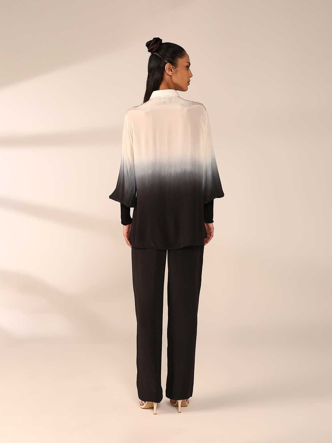 A relaxed fit ombre shirt highlighted by a vertically placed botanical embroidery . styled with straight pants for a perfect balance between comfort and elegance.